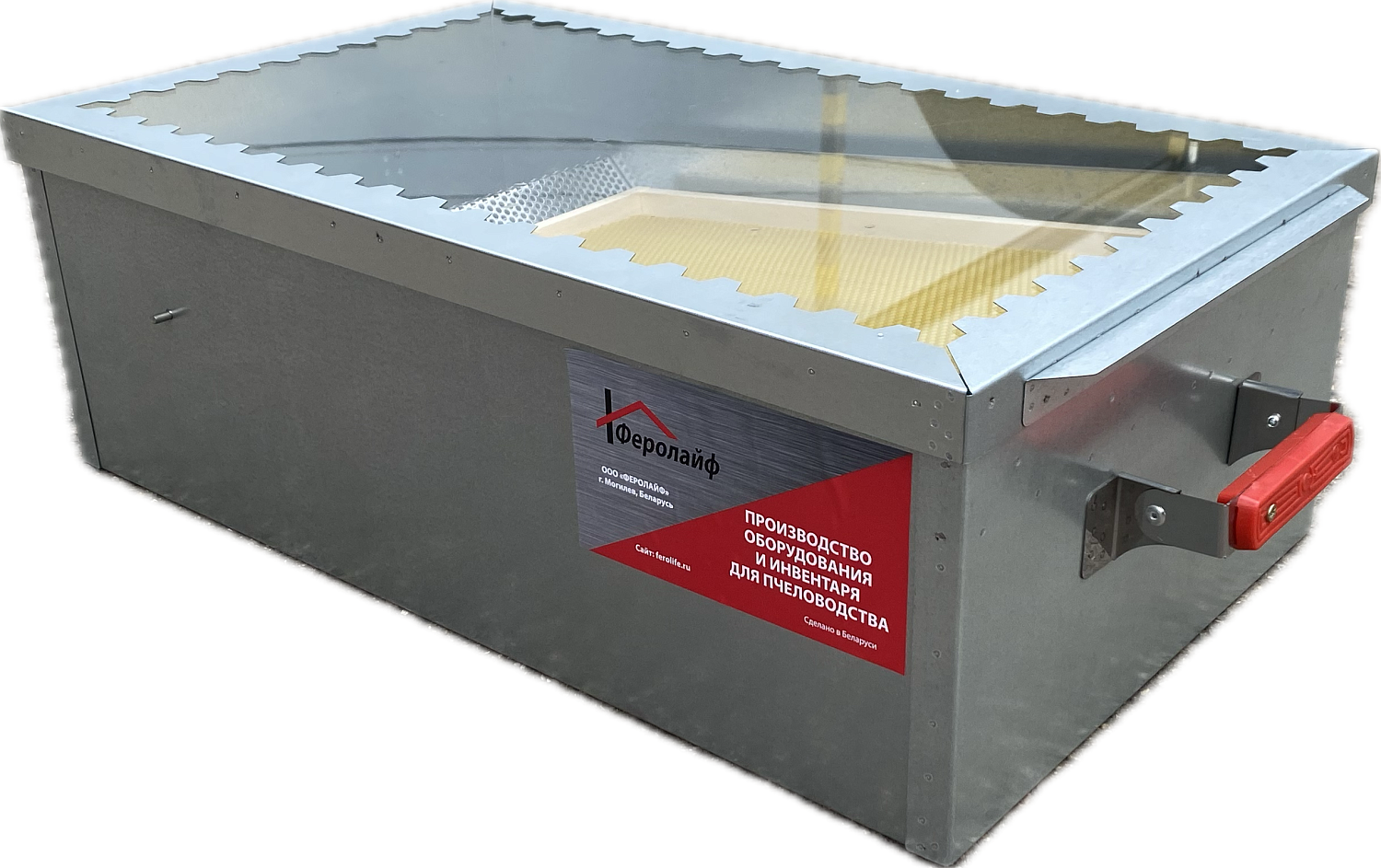 Корпус представленной модели изготовлен из оцинкованной стали. Его размеры: длина — 690, ширина — 380, высота — 225. Внешние габариты воскотопки равны 740×450×225. Рама крышки изготовлена из оцинковки.